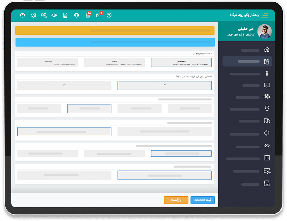 کنترل و مدیریت امور خرید، تدارکات و بازرگانی، برگزاری الکترونیکی مناقصات و مزایدات و تعیین برنده