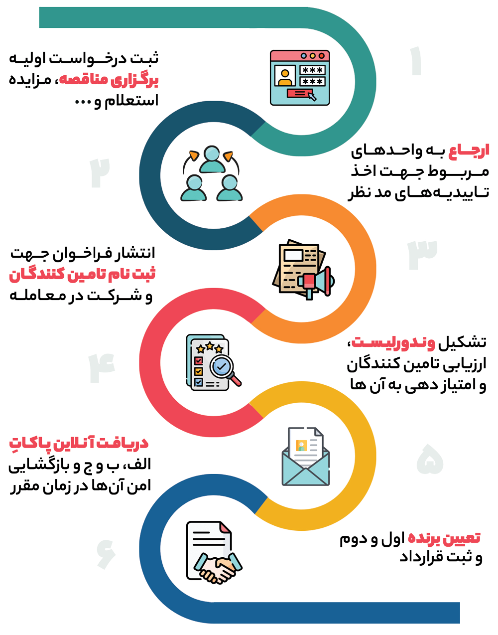الکترونیکی کردن تمامی فرایند خرید و تدارکات از مرحله ثبت درخواست اولیه تا دریافت پاکات و تعیین برنده